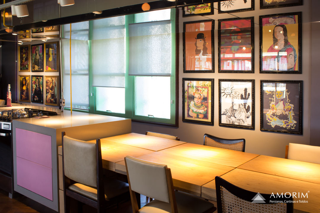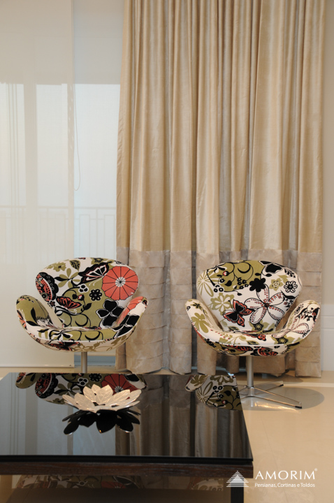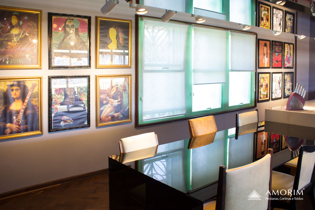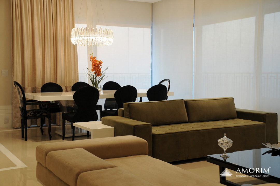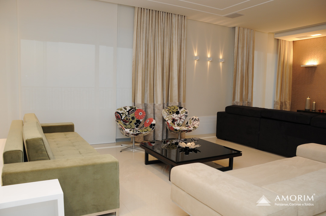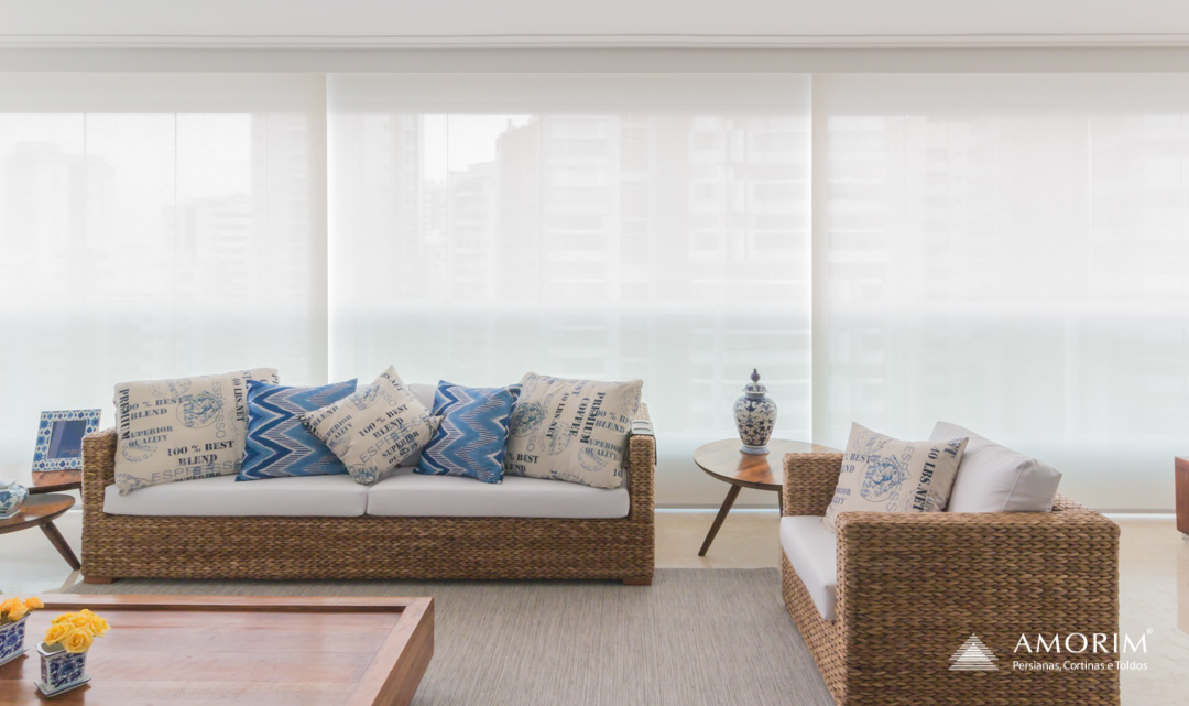 A cortina Rolô apresenta uma grande variedade de tecidos translúcidos, semiopacos e opacos e tecidos solares em fibra de vidro com PVC que minimizam a incidência dos raios UV, aliando conforto térmico e visual ao design moderno e sofisticado.