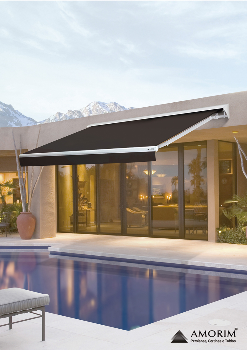 Um novo conceito em toldos comerciais, o Toldo Bali Amorim possui um design clean, complementando ainda mais a sua fachada. Seu sistema moderno se diferencia no mercado, pois sua estrutura em alumínio aumenta a durabilidade e não enferruja, além de seus braços pivotantes com molas tensionadas, que permitem que seu tecido fique completamente reto e garantem maior estabilidade da barra frontal.